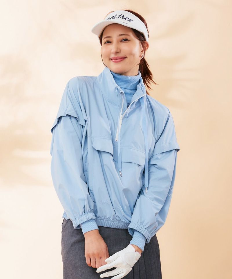 撥水性のあるナイロン素材を使用したブルゾン。袖を取り外して半袖としても着用できるデタッチャブル仕様で、季節やスタイルに合わせてアレンジが可能です。前身頃の中心・両脇・背中に配した大容量ポケットは、ラウンド時の収納力も抜群。