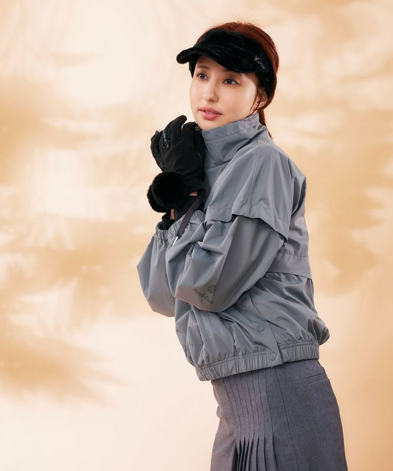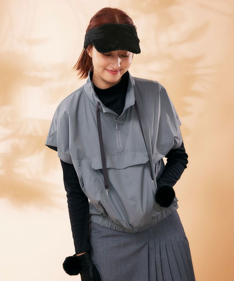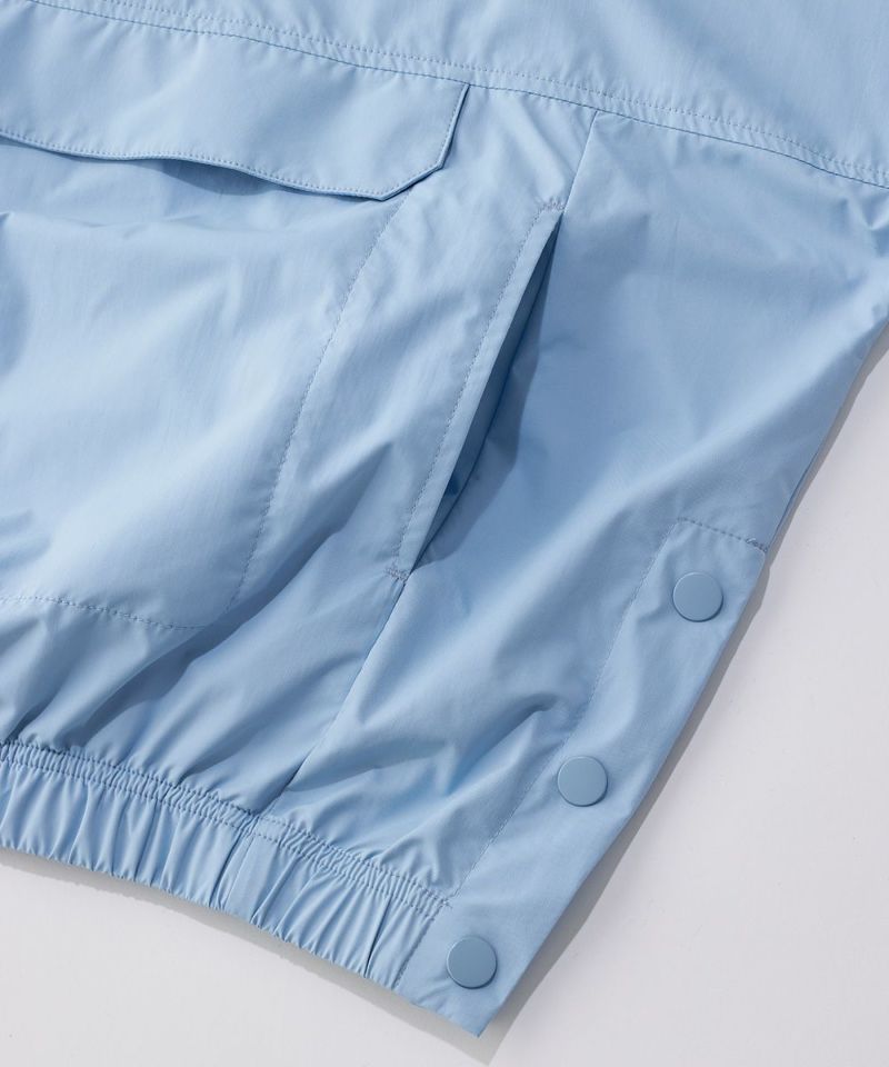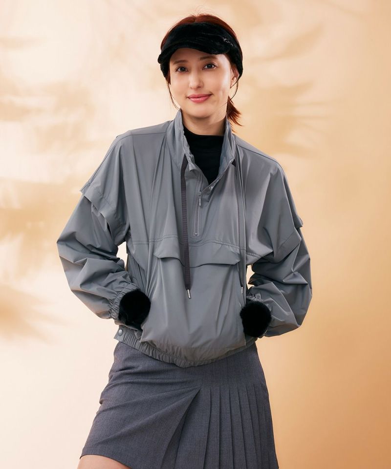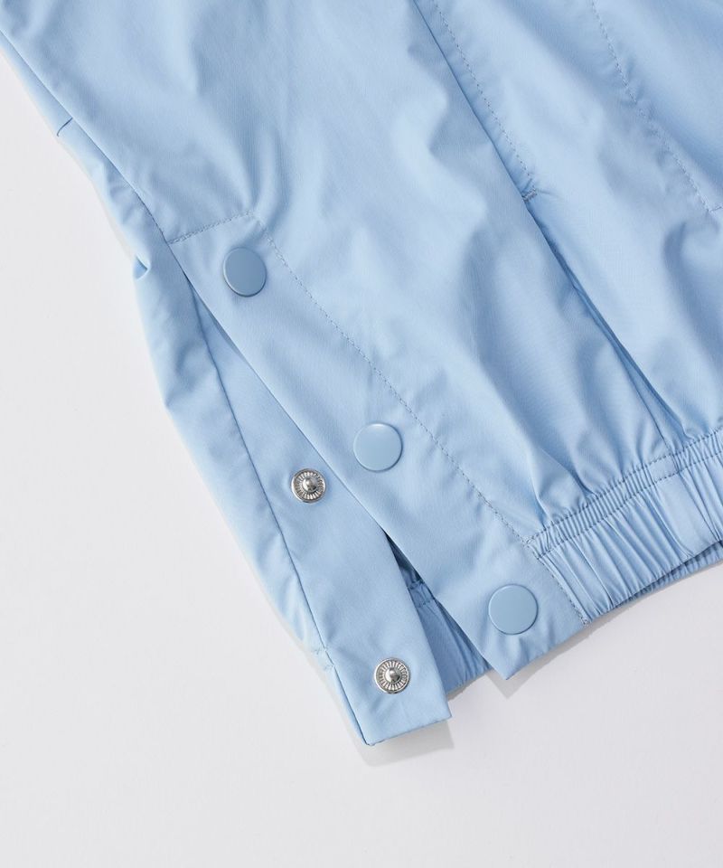 脇のスナップでシルエットを調整でき、衿のスピンドルで衿元の印象も自在に変えられます。衿口は広めに設計されており、スイングの際も邪魔にならず快適。機能性とデザイン性を兼ね備えた、シーズンを通して活躍する万能アウターです。