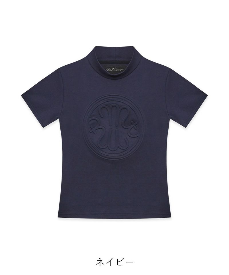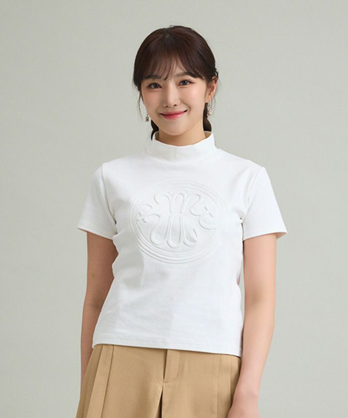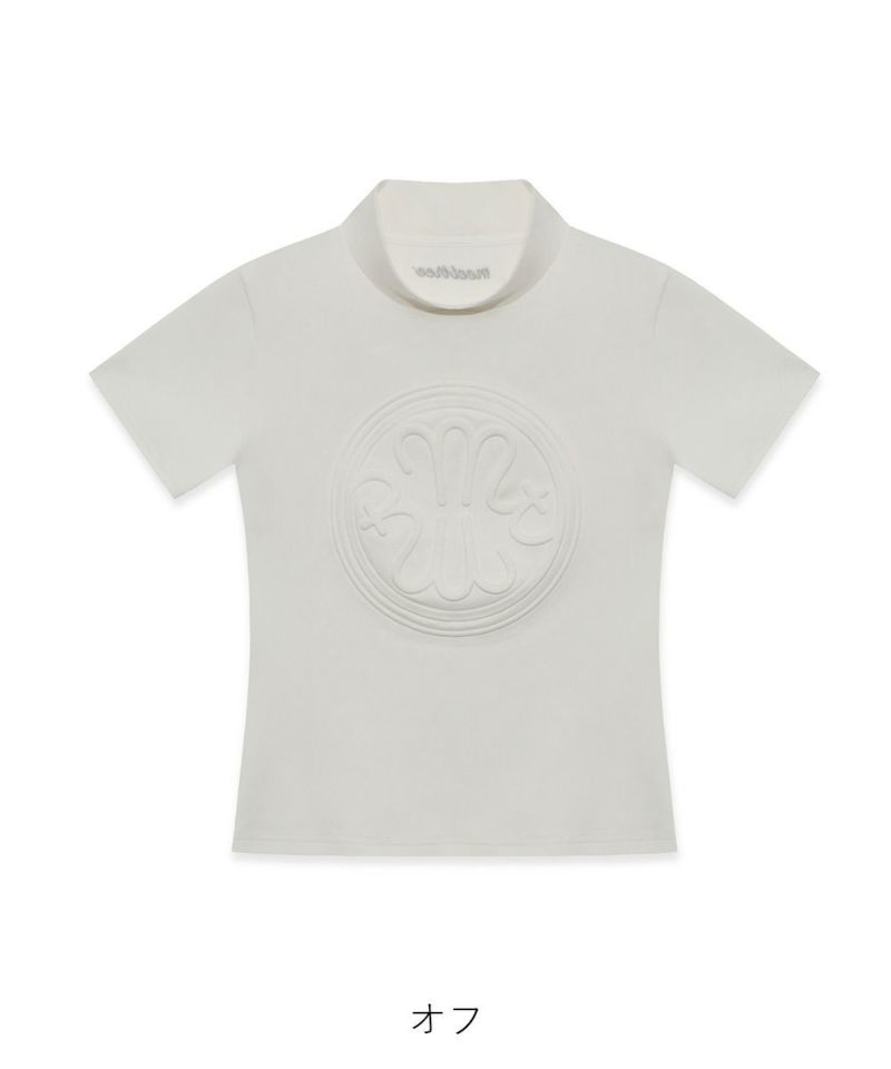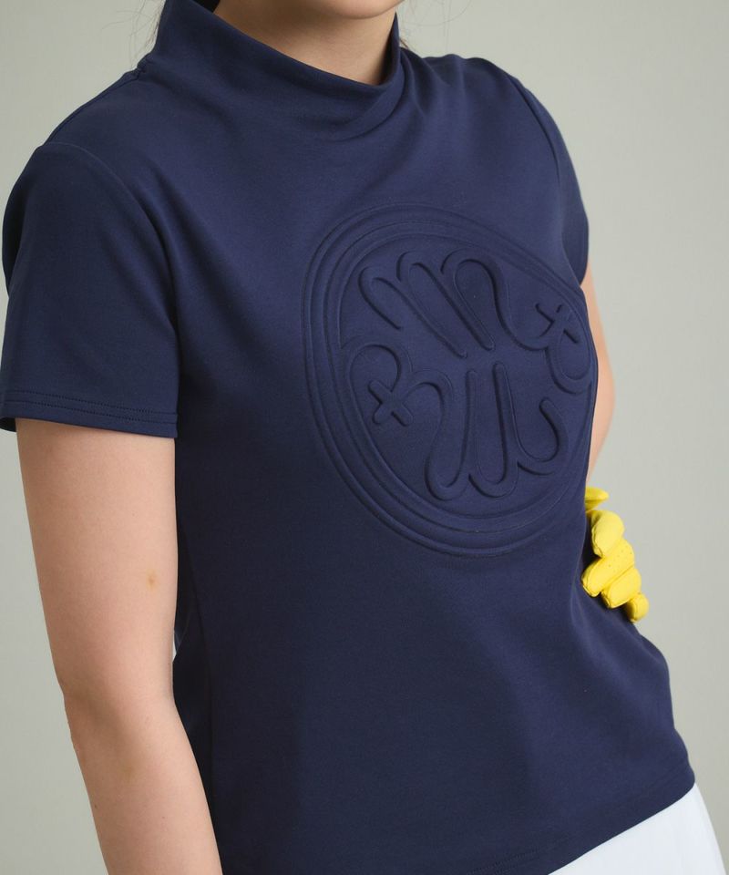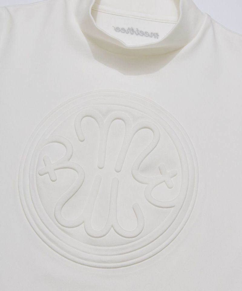 胸元に大胆にあしらったロゴエンボスが印象的なモックネックトップス。