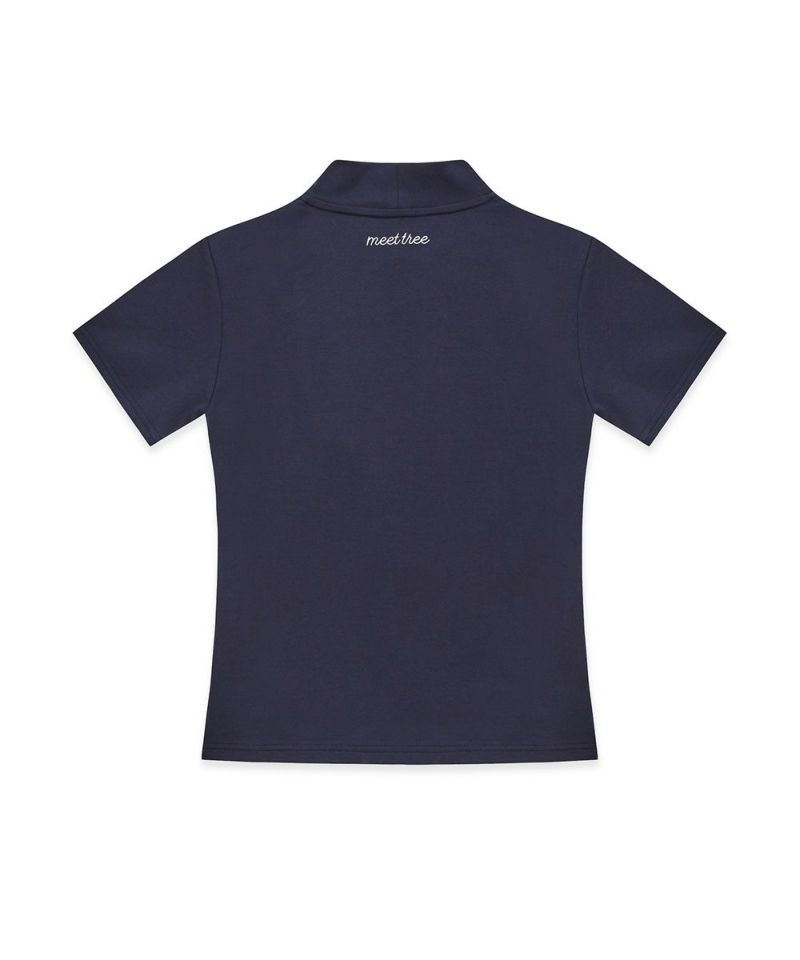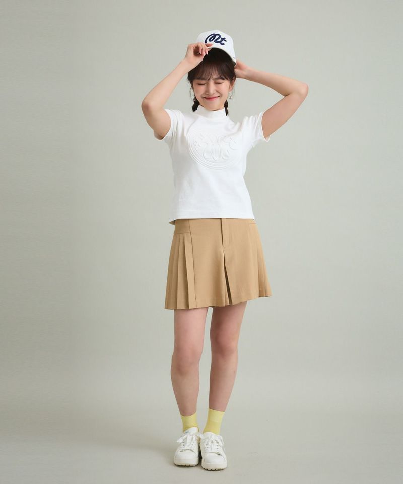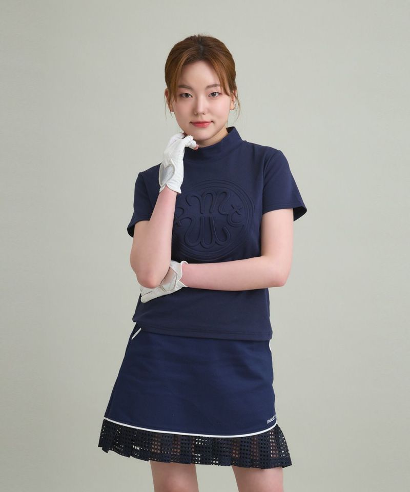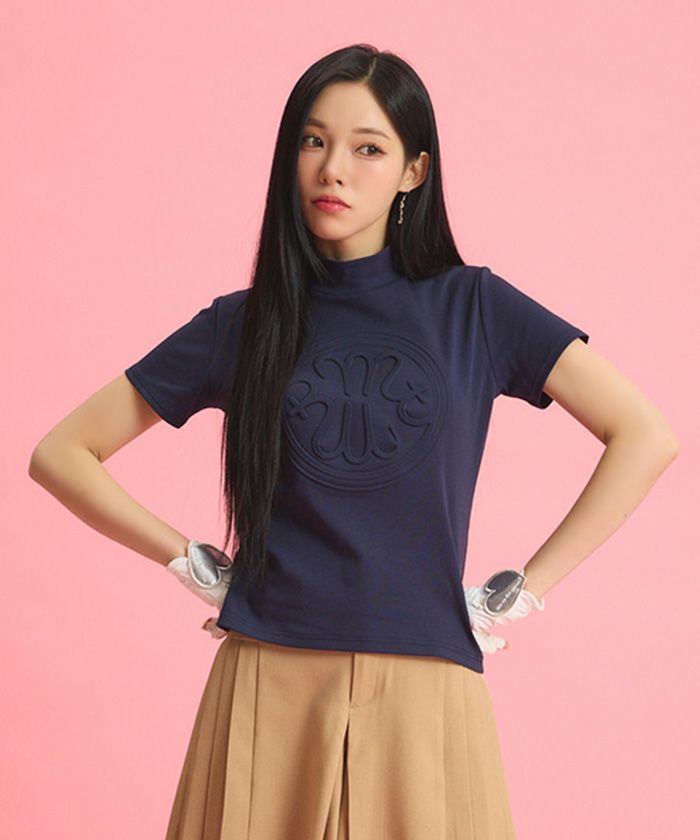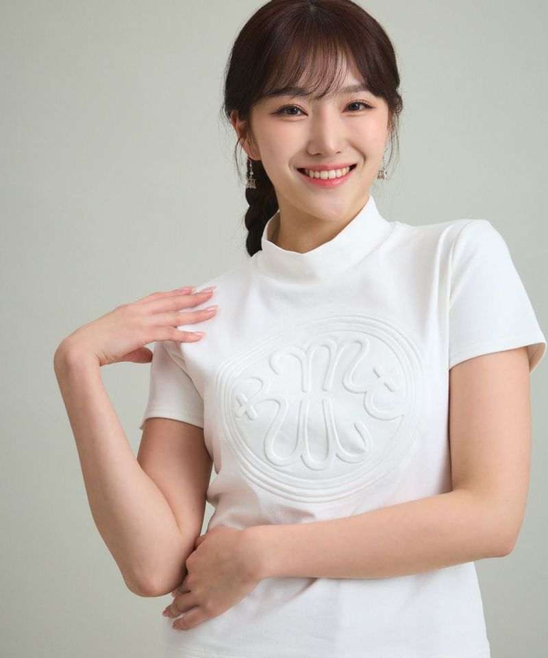 胸元に大胆にあしらったロゴエンボスが印象的なモックネックトップス。